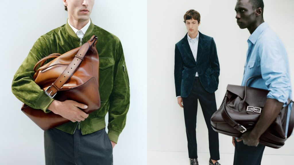 Spring accessories mix and match the signatures of Berluti. The B Volute loafer and 48-hour bag in grained leather integrate an archival iron moulure emblem adapted from the staircase in the historic Rue Marbeuf boutique. A square-toe loafer and boot in grained leather appropriate the double-flap of the Grand Ecritoire briefcase. Crafted in flexible Venezia leather, the Demesure Flex is a comfort-driven take on the Maison’s formal shoe of the same name. With its envelope-shaped bottom and trompe l’oeil front pocket, the Toujours messenger evolves its namesake tote bag into a soft, roomy design in Ice Gold or Jungle Green Venezia leather.