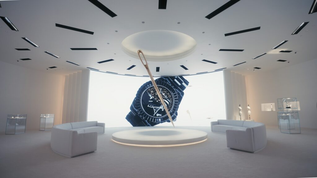 This year, the CHANEL booth revolves around an impressive golden needle, reflecting the shape of the sundial, who embodies the House’s vision: between elegance and expertise. Echoing the Capsule Collection dedicated to Couture, origins of the House, it showcases one of the main elements that make the link between the Couture universe and time: the sewing needle reflecting the dial’s hand. A true Couture tool characterized both by its elegance and its timeless line, positioning CHANEL as a master of time, using couture to create time.