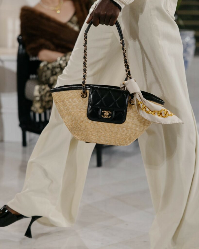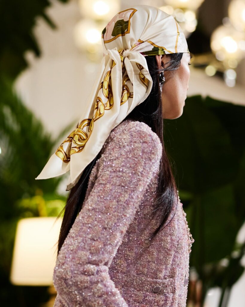 As models took to the runway, the collection once again revealed its multifaceted universe imbued with diaphanous glamour and luxurious comfort. Trouser suits and evening pyjamas in supple tweed, gold lurex or entirely embroidered with sparkling sequins are followed by pink and orange striped lamé silhouettes and short taffeta ball gowns with flounces in pastel hues worn with long gloves. A range of sunny colours and floral motifs unfold over lace and prints, while cruise codes – straight-cut white trousers, pea coats and stripes – sketch an allure that is timeless and relaxed. Silk satin scarves tied in the hair and around ankles or wrists complete the look.