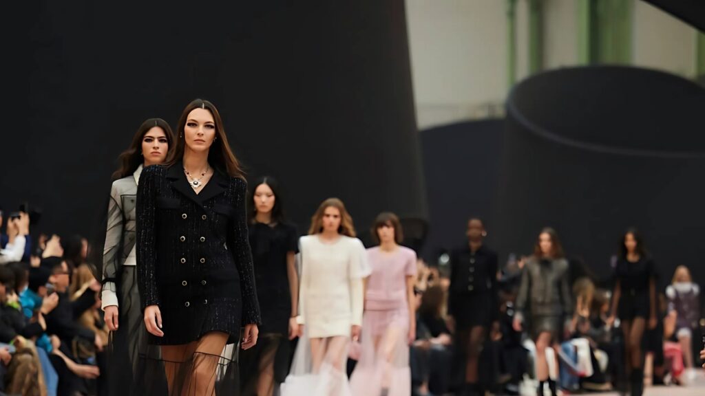 Like a theatre of dreamlike illusions, the CHANEL Fall-Winter 2025/26 Ready-to-Wear collection, presented by the Creation Studio, plays on scales of size, length and proportion. Beneath the glass roof of the Grand Palais, an installation designed by scenographer Willo Perron dances over the floor while soaring into the air. With his black ribbon as a monumental backdrop, the collection leans into points of reference and alters perceptions.