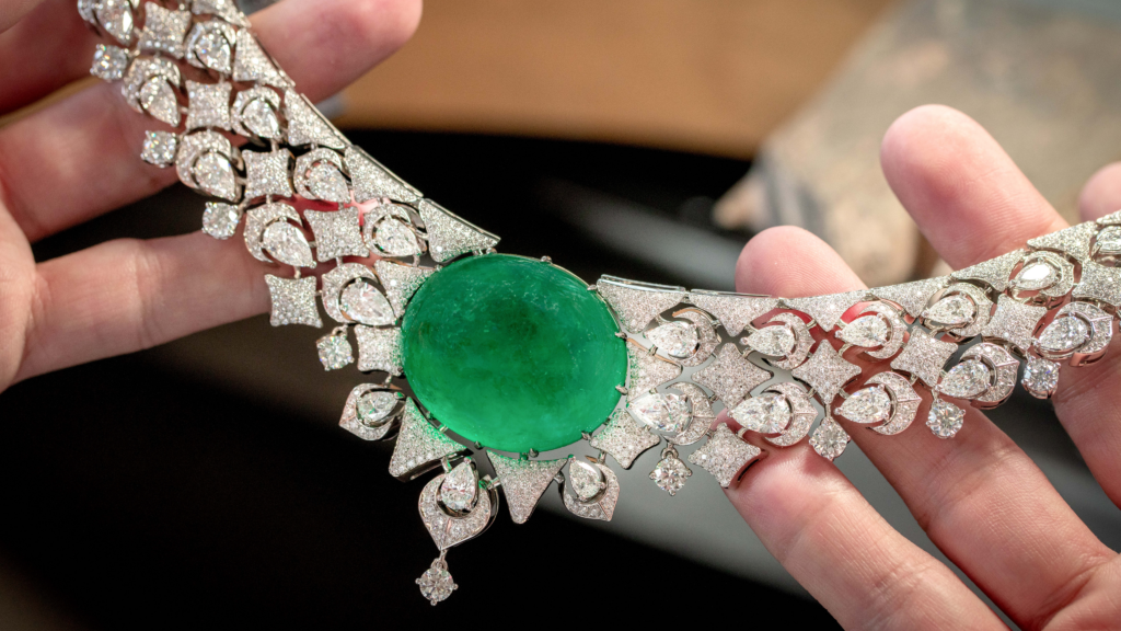 As the opening date of the 78th Cannes Film Festival draws near, Caroline Scheufele reveals the first creation from this year’s Red Carpet Collection: a magnificent choker. This necklace, made of white ethical gold and diamonds, most prominently features an exceptional 129-carat Colombian emerald cabochon. The result of 450 hours of collaboration between the atelier’s various master artisans, this bejewelled marvel is sure to cause a sensation around the neck of one of the actresses on the Croisette.