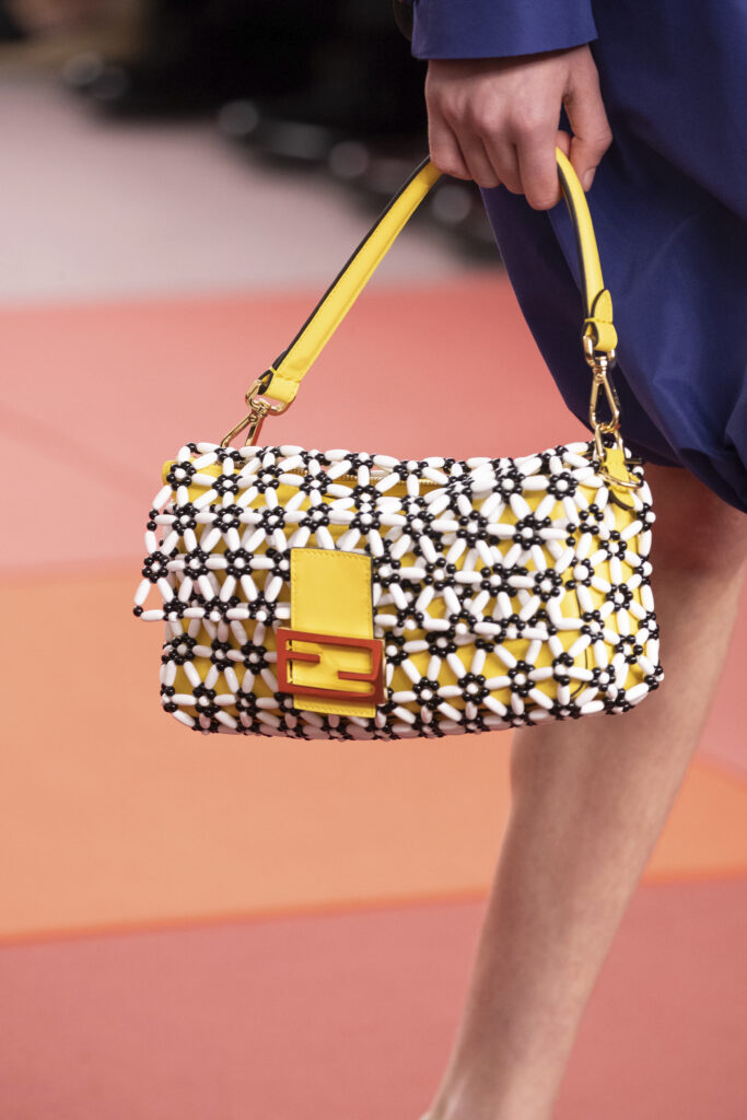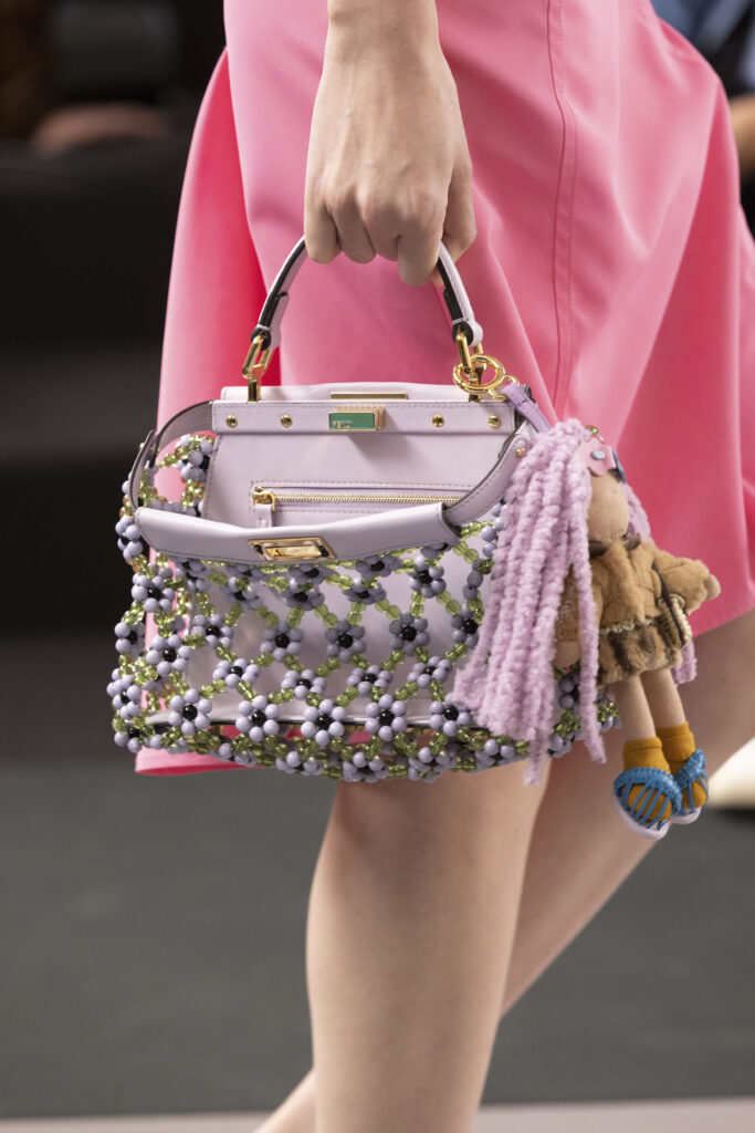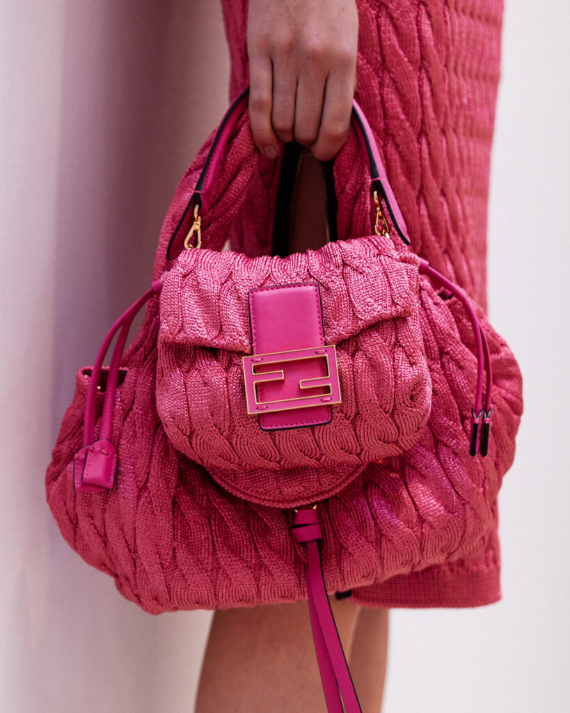 The FENDI Spring/Summer 2026 accessories collections are a dazzling display of innovation and wit, elevated with textures, structures and 3D embellishments that echo the collection’s weightless summer flair. As though laced through a string of beads, the new FENDI Collier handbag features a drawstring pouch ruched on a bauble handle with FF accents, whilst the FENDI Hobo framed with Selleria stitching adjusts on a sliding leather pom-pom. Both the FENDI Baguette and soft FENDI Spy bag return crafted in cable knit silk, as FENDI Peekaboo styles are embellished inside or out with transparent floral beaded cages, sequined inner pockets, or woven basket leather constructions. Spacious and deconstructed, the new trapezoidal FENDI Way bag is crafted in bright suede and calfskin with minimal gilded hardware.