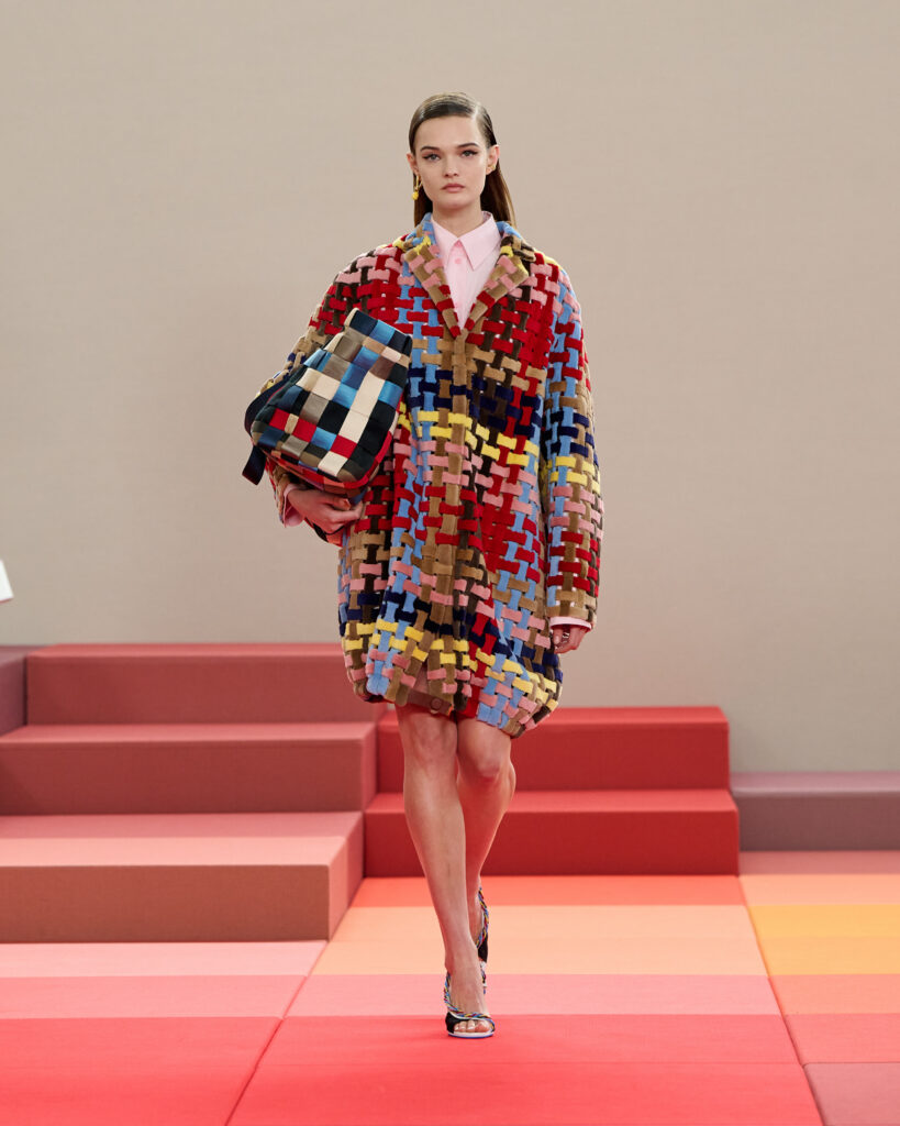 In a set designed by Marc Newson, a pixelated color field undulates in kaleidoscopic communion with essential FENDI silhouettes that transcend and transform archetypes. Bright hues define understated volumes that sheath the body in weightless expressions of positive and negative space. The familiar is FENDI-fied, reconstructed and deconstructed to play with intimacy inside-out. Structure and strictness are pared down with soft flourishes. Crisp, crunchy, transparent and lustrous, fabrics are engineered for urban adventures.