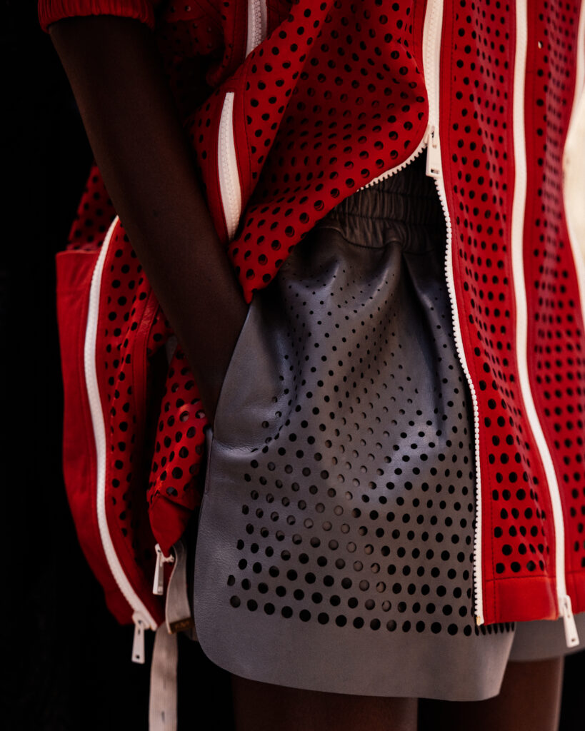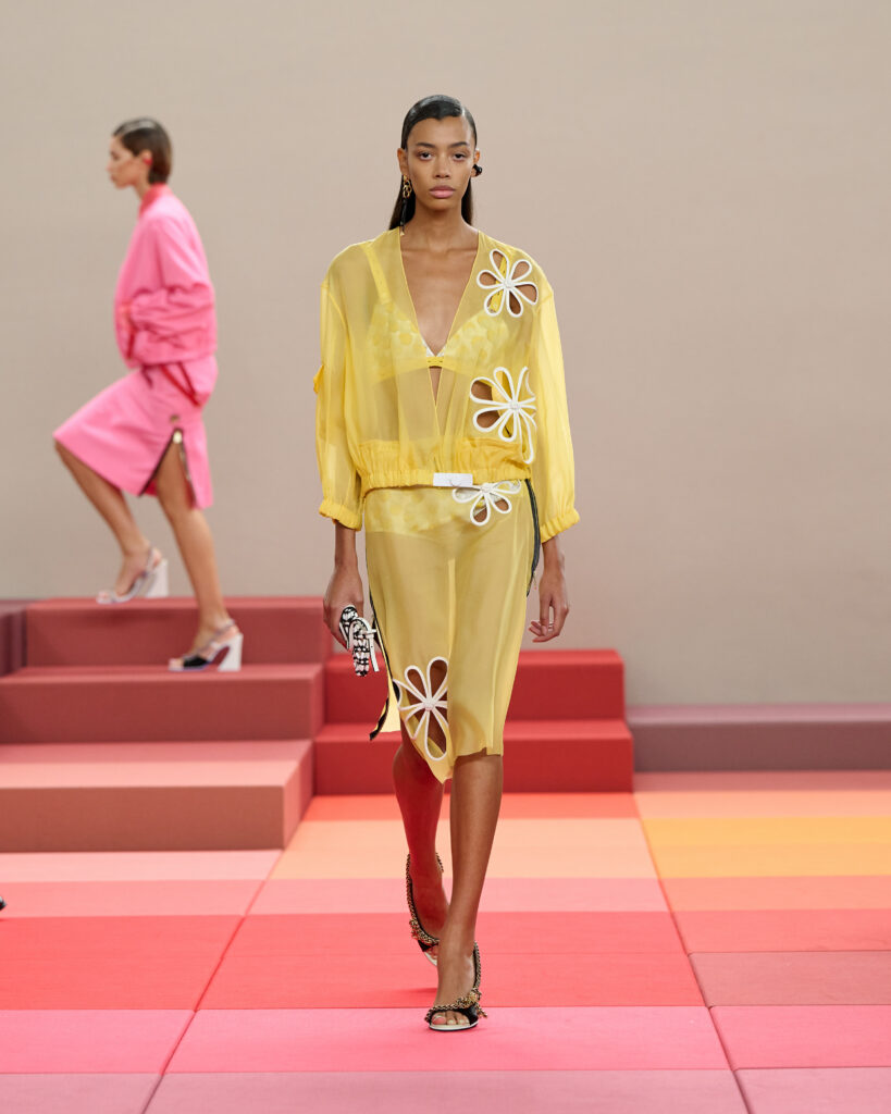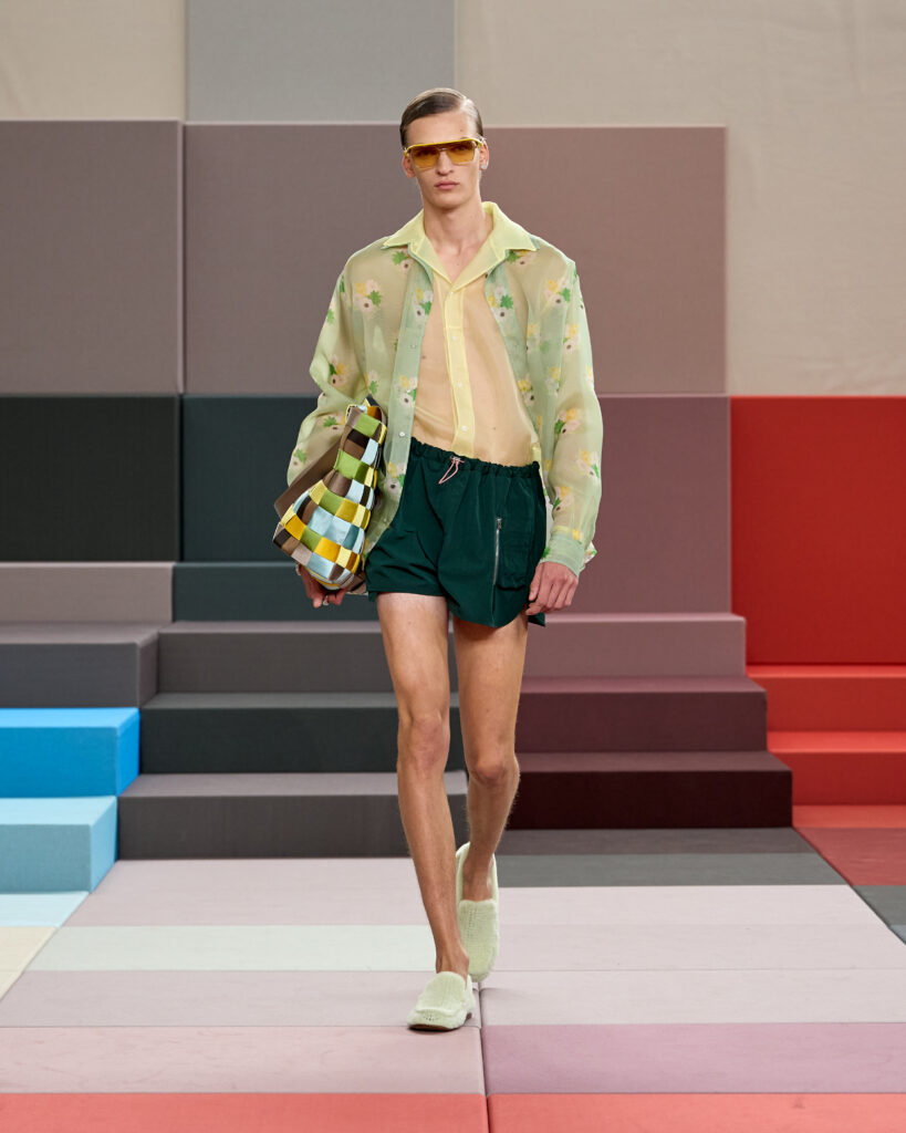 Conceived together, a shared spirit ping-pongs between the FENDI Women’s and Men’s collections. Evoking suspenders and corsetry, bright buttonhole tabs punctuate jackets and frame skirts for adjustability. Impressionist floral accents bloom and grow, printed across iridescent layers, piped into dewdrop daisies or sculpted as ironic ‘sunny side flowers’. Unzipped and cinched, double-faced or drawstring, soft tailoring and sportswear shapes are electrified in an edible palette of juicy shades. Here, saturated color is a balm – a therapeutic shock of joyful abandon. From bold white, concrete and soft, sunny yellows towards turquoise, vermillion, bubblegum, coral pink and all manner of candy combinations, the tonal twist of primary colors, pastels and earthy neutrals define a polychromatic system. Contrasting panels, two-tone jerseys, perforated leathers and sheer jacquards create relaxed yet modular clothes that conceal and reveal.