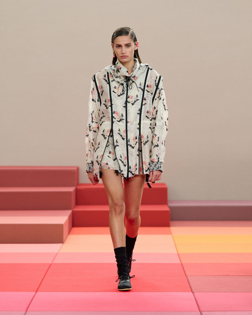 Caught in a scrunched balloon hem, short blazers and loose cotton coats embody the season’s nonchalant elegance, as organza collars and frilled cuffs on a bomber jacket do, or tiered skirts with a fishtail kick. A man’s shirt is reworked myriad ways – as tuxedo bibbed blouses and irregular box-pleated mini’s, to the slender darted shape of a button-down shirt dress. Both boyish and ladylike, ensembles toy with opulent materiality, manifesting in translucent organza or crochet polo shirts, silk cable knit twin sets, or technical shell suits with plush panelling. Celebrating FENDI workmanship, glossy disc embroideries echo polka dots and perforations, tiny bouquets are painted on cartoon floral guipure, and daisy or woven motifs embolden shearling and plush coats with a graphic nostalgia.