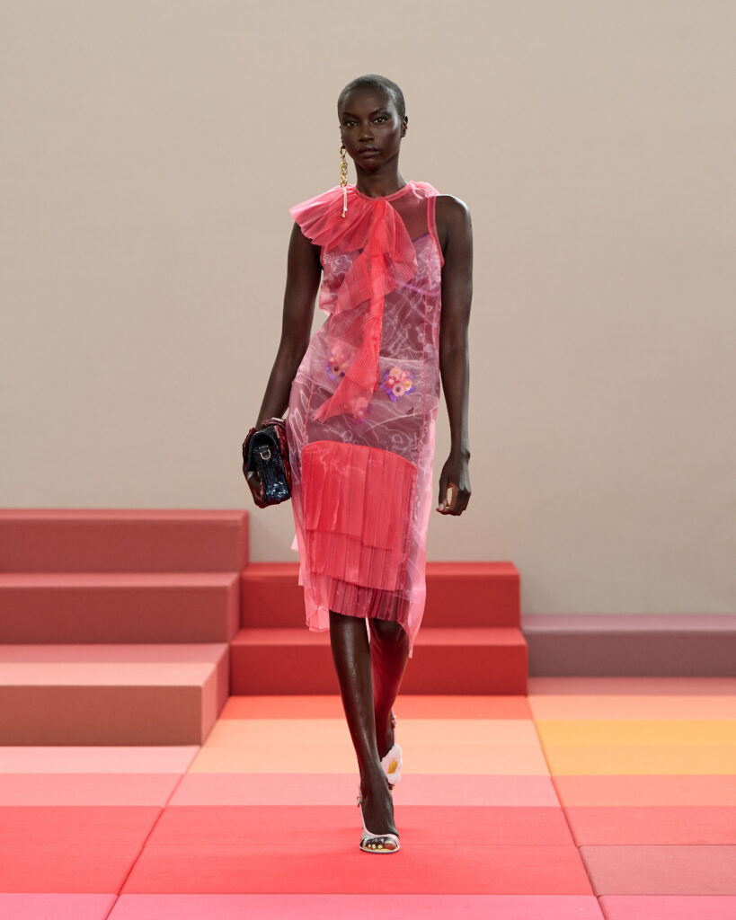 A future summer, seen through a fantastical FENDI lens. The legibility of desire resounds in melodious geometries of color, blazing in shifting landscapes. Sensuality is paramount, as Silvia Venturini Fendi delves into optical games of featherweight form.