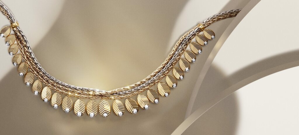 For Toussaint, precious metals such as gold is the most obvious choice for the line, because she knew that it would be suitable for every occasion. The collection became the expression of joyful and luminous jewellery that would shine until her departure from the Maison in 1970. Most often made of yellow gold, although sometimes also sculpted in a noble material such as coral, the pieces are most often studded with diamonds or coloured stones, and sometimes even half-paved.