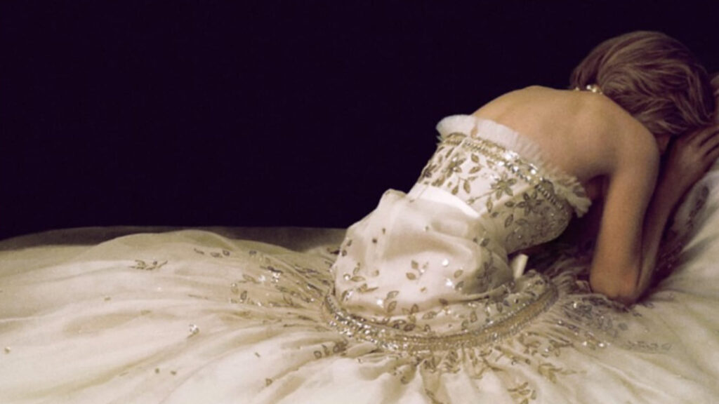 On the poster of Pablo Larraín’s film ‘Spencer’, Kristen STEWART, CHANEL Ambassador and lead actress who plays Princess Diana in the movie, is wearing a beige organza evening gown embellished with gold and silver round, oval or leaf-shaped sequins forming floral branches, look 82, from the Spring-Summer 1988 Haute Couture collection.