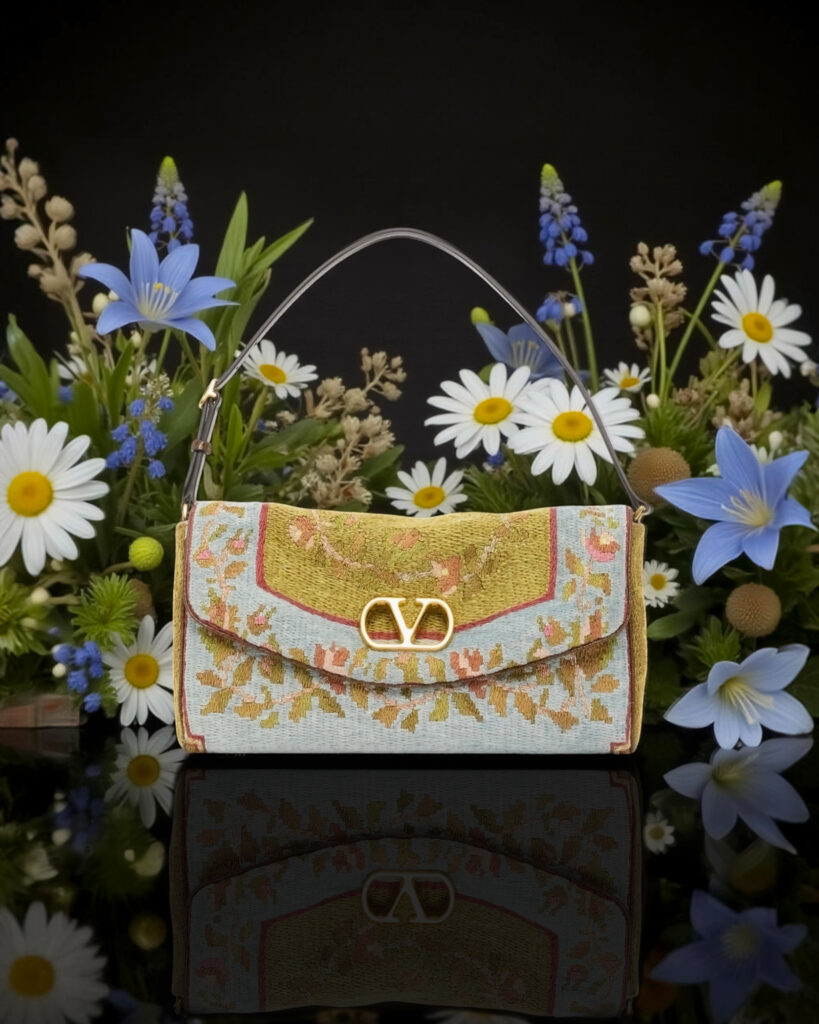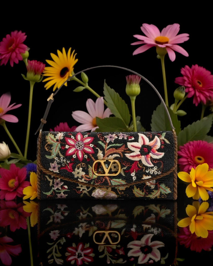Available from mid-November, the DeVain comes in twenty-seven variations: from monochrome versions in nappa or metallic nappa to denim, crochet raffia and shearling embellished with multicolored crystals. Precious skins, thread and bead embroideries, and romantic combinations of floral garlands and velvet further expand the expressive universe of the bag.