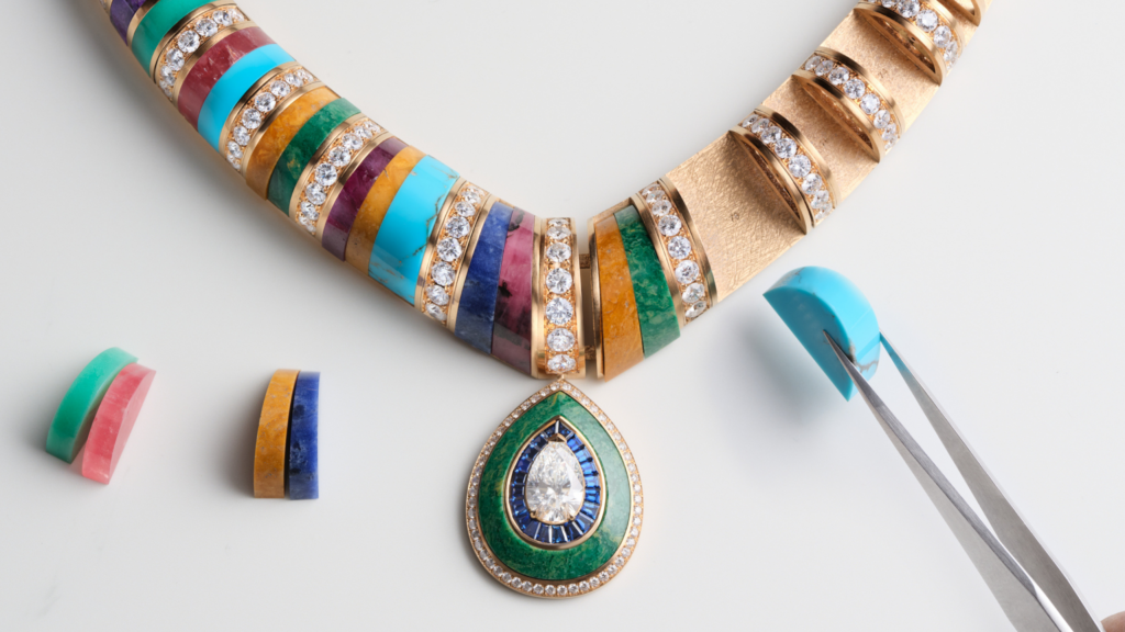 The 2025 High Jewellery collection in the Extraleganza series deep dives into the Piaget’s heritage. Experimental, unexpected yet with warm echoes of familiarity, Shapes of Extraleganza is a study in form, colour, texture, light and volume, a supremely sophisticated evolution of Piaget’s high-energy play of shapes. Shapes within shapes, squares, triangles, zig zags, waves, circles, interlocked, overlaid, jostling joyfully in sculptural and conceptual, highly stylised compositions that perfectly harmonise fluidity and precision. Through 51 creations, Piaget plays with graphic lines, geometric angles, sliver-like triangles, as well as organic free form shapes and sensual curves, while referencing Pop Art, Op Art, the swirling psychedelic patterns of 70s fashion or the generously rounded, plump contours of 60s design icons. Reflecting the high-low cultural mix that characterised 1970s society, High Jewellery meets Pop Culture.