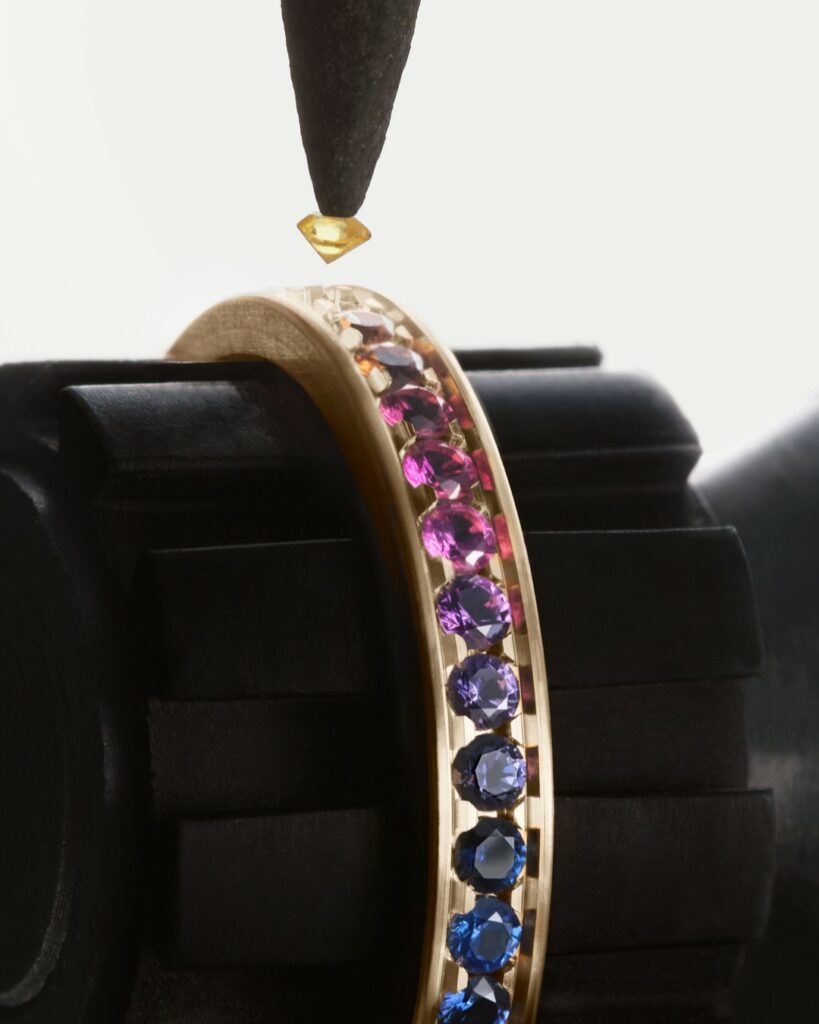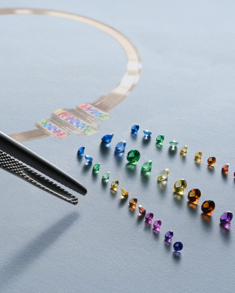 Rainbow setting requires millimeter precision. Each stone – diamond, ruby, sapphire, tsavorite – is selected by a gemologist for its hue and size, thus guaranteeing a perfect gradation of the colors of the rainbow. A major technical challenge. This complexity is coupled with the meticulousness of the Decor Palace, another distinctive code of the house. Created in 1961 and rediscovered in the archives in the early 2000s, this goldsmithing work transforms gold into a textured surface with unique irregular reflections. Each craftsman has his own savoir-faire, making each piece unique, in his image, and thus continuing the singular charm that has always surrounded Piaget creations.