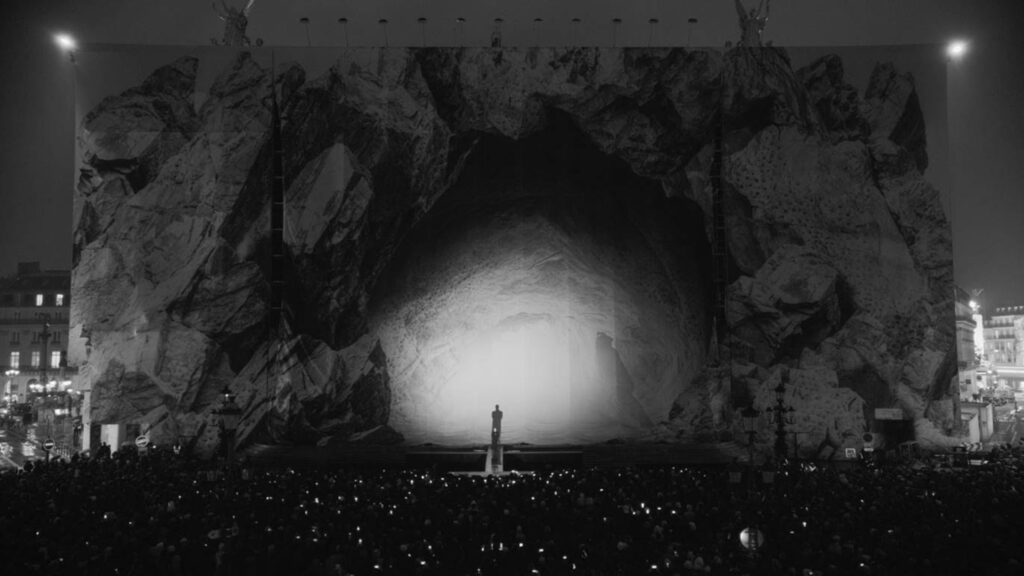 While the first Act of JR’s “Retour à la caverne” referred to the origins of ballet and opera, blending the classical architecture of the building’s colonnades with the archaic structure of a geological opening, Act II invites us to go even further back in time. The cavern becomes a protective place, sheltering its residents from the violence of the world. The darkness reveals light.
