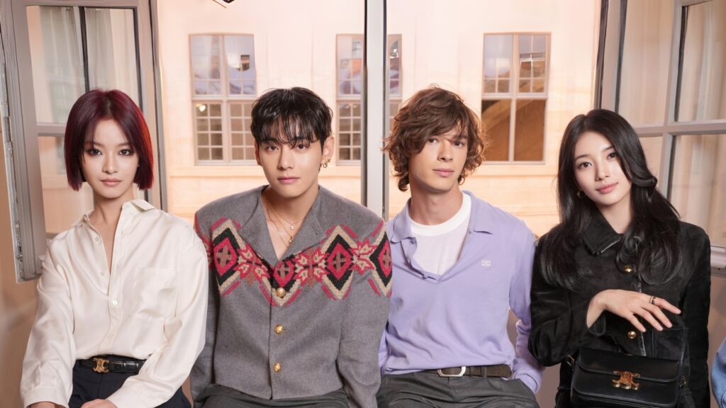The audience was as captivating as the collection itself. Among the many notable guests in attendance, a few names stood out for their presence and poise. Fresh from his military discharge, Global Ambassador V (Kim Tae Hyung) made a striking return to the public eye, embodying CELINE’s moody cool with ease. Beside him, fellow ambassadors Suzy Bae and Park Bo Gum offered their signature elegance, each a reflection of the Maison’s quiet luxury.