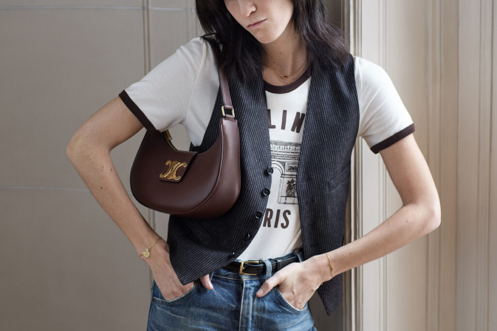 Draped elegantly over the shoulder, seamlessly harmonising with the bag’s distinctive half-moon shape, the Ava Triomphe bag transcends accessory status to become an indispensable component of the quintessential Celine silhouette. Its design not only pays homage to the iconic aesthetics intrinsic to the brand’s DNA, but also showcases a harmonious union with the celebrated Triomphe motif, an emblem that encapsulates the very essence of Celine’s renaissance.