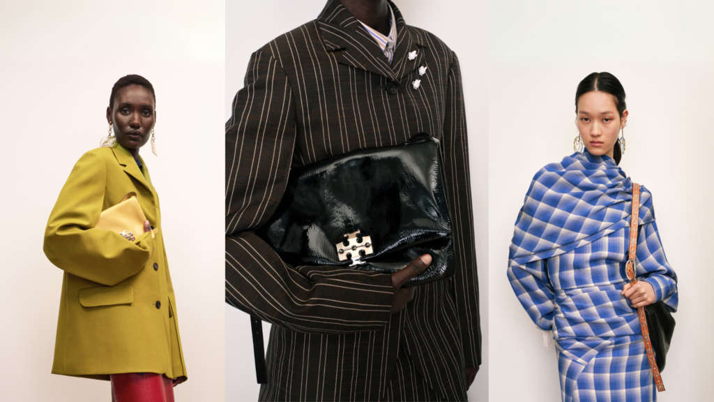 “Our take on sportswear archetypes. The polo, the cardigan, the trench, the skirt suit, the five-pocket jean — reinterpreted as something new. Utilitarian workwear and prep gestures are warped, in an offbeat palette of chartreuse, cobalt, and classic neutrals.” —Tory Burch